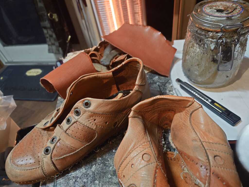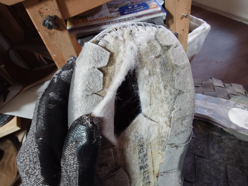 スノボブーツの底材が劣化して縫うてあった場所が切れてたやつを直してから接着しなおしです♪