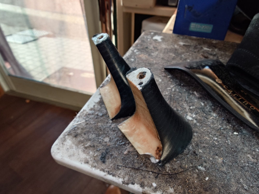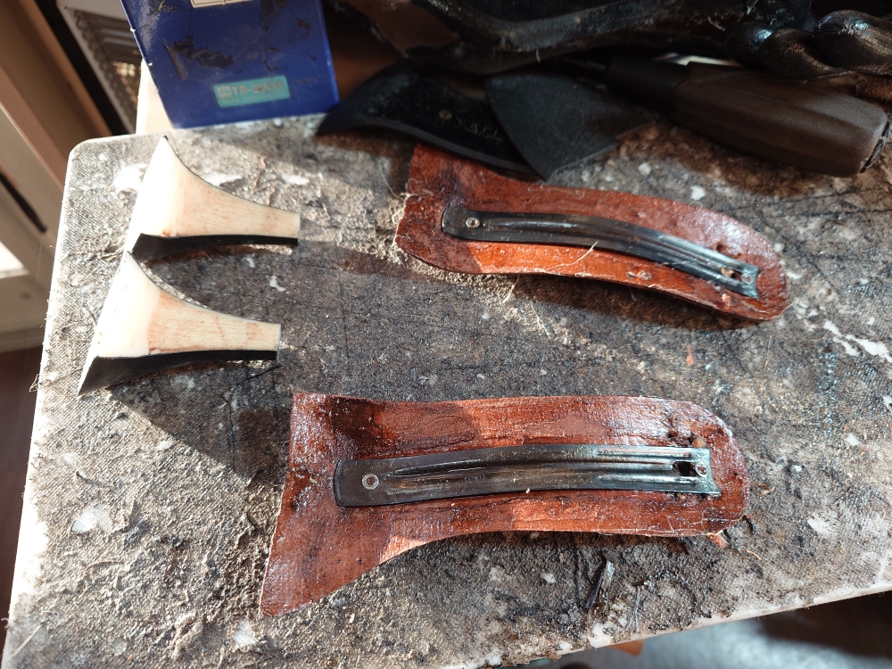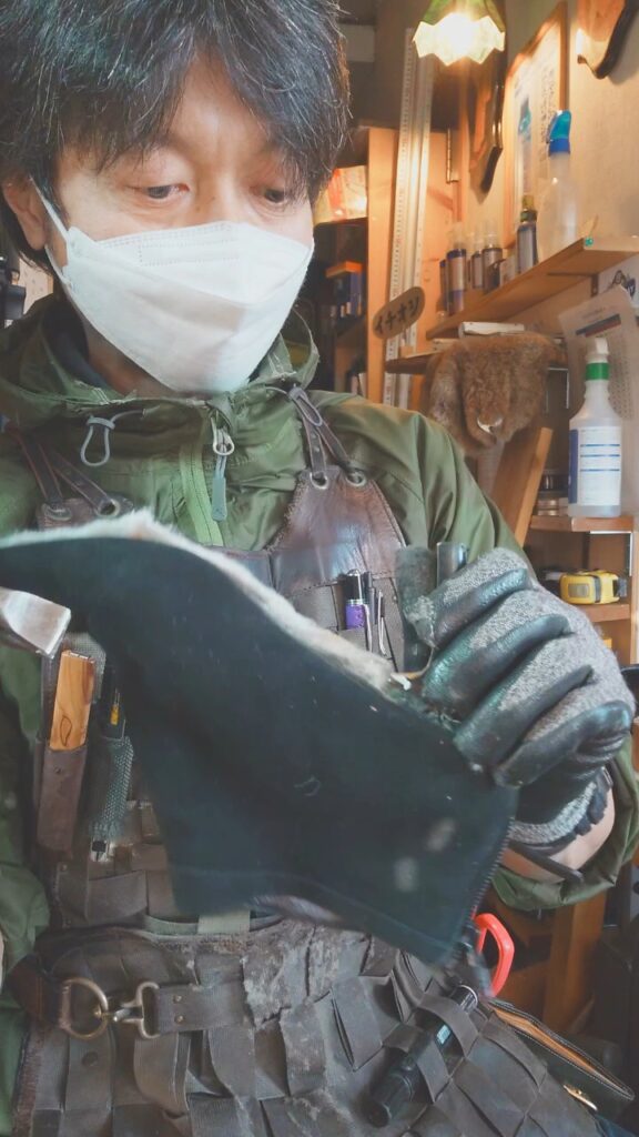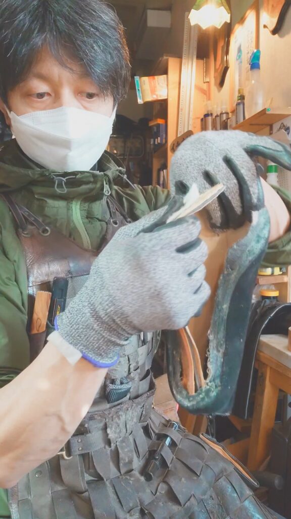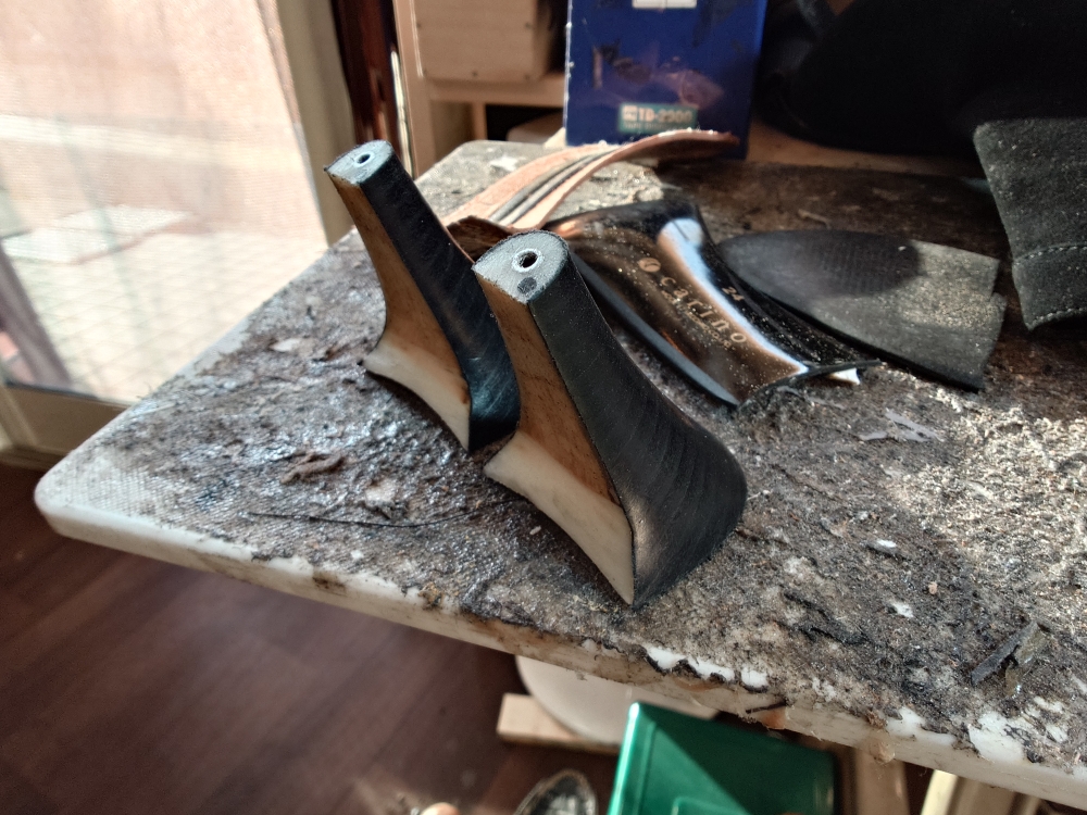 捲りあげて貼ってあるヒールのアゴ部分もペラッペラの革が所々吹っ飛んでるんでサクッと作ります♪