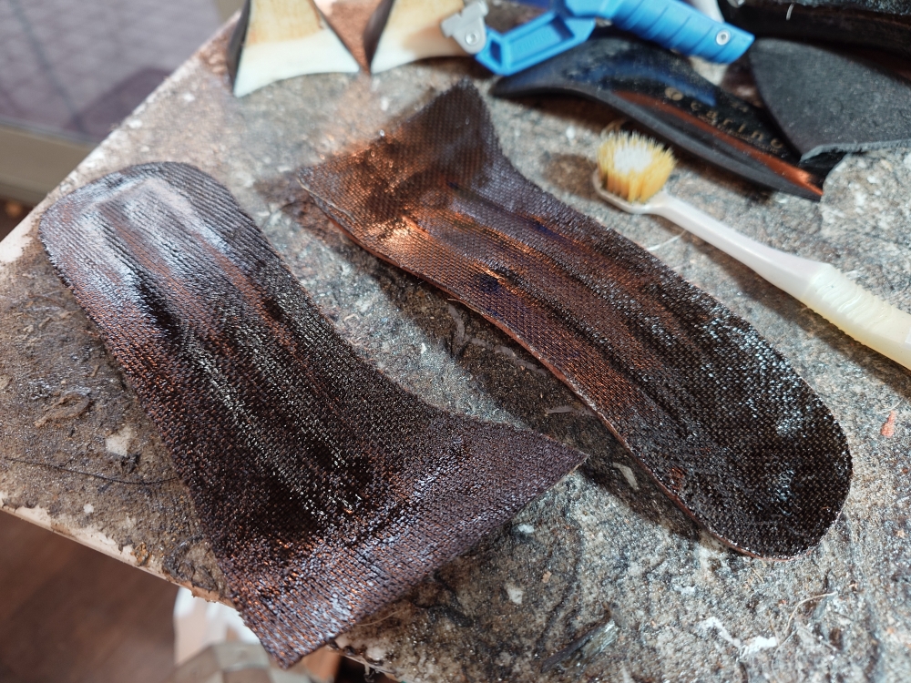 強化ファイバー芯の上に貼り付けられるところで明日に続く♪