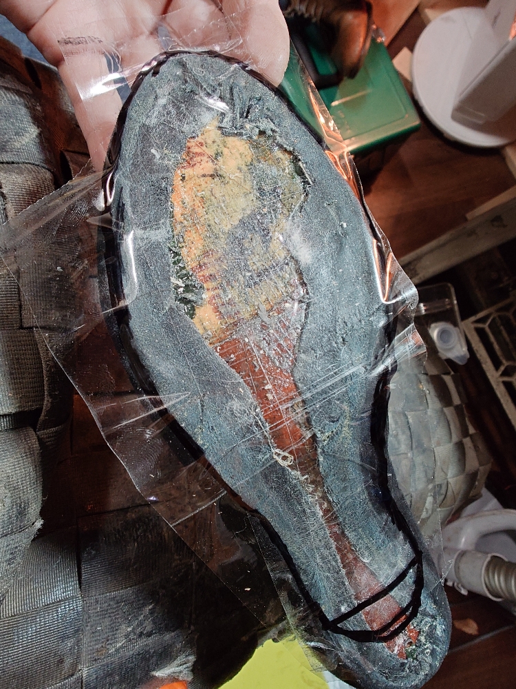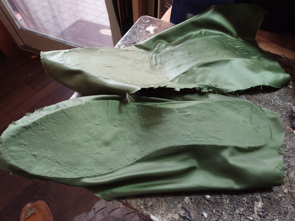 そこら辺に転がってる、ホンマは別件で使われる予定のバリスティックナイロンのコーティング面にN330ブースターを塗ってからN7000+を塗って乾かしてるとこです♪