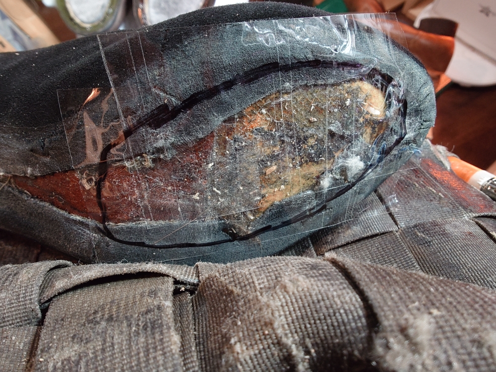捲りあげて貼ってあるヒールのアゴ部分もペラッペラの革が所々吹っ飛んでるんでサクッと作ります♪