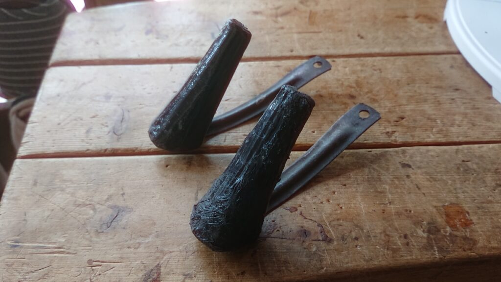 崩壊したウレタンの中から掘り出したシャンクとヒール芯。