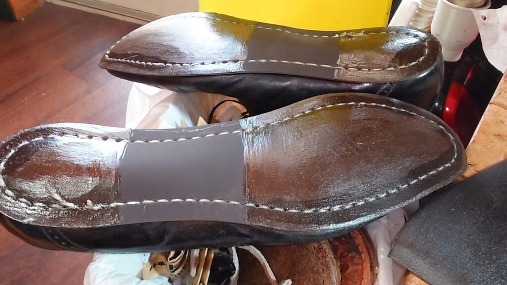 ベースがガッチリ縫い付けられたら、あとは接地面を保護するハーフソールやヒールの部品を貼り付けて行きます♪