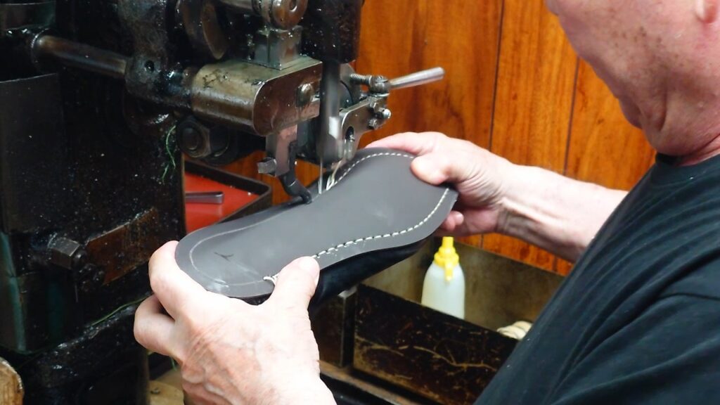 底縫いを掛けた後は接地面にハーフソールを貼って糸切れを保護します。